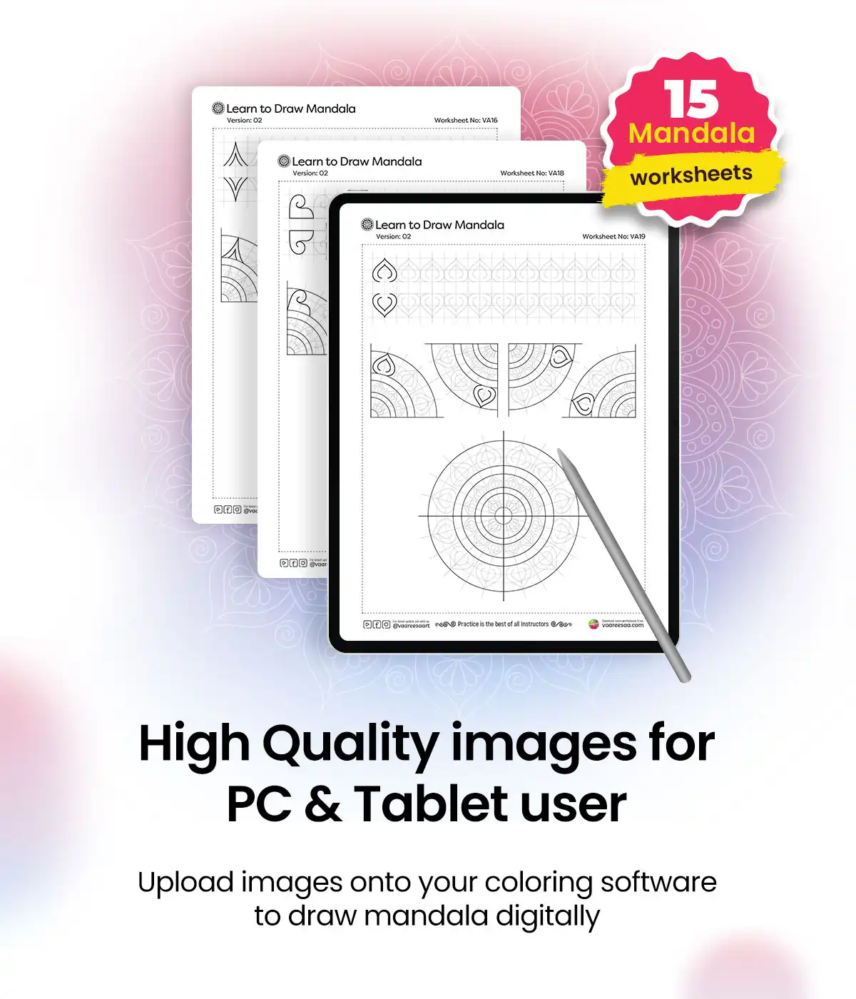 Whether you’re at home or on the go, these portable worksheets and digital image files (perfect for iPad and tablet) are your ideal travel companions. Take them with you and experience the calming joy of mandala drawing anytime, anywhere.